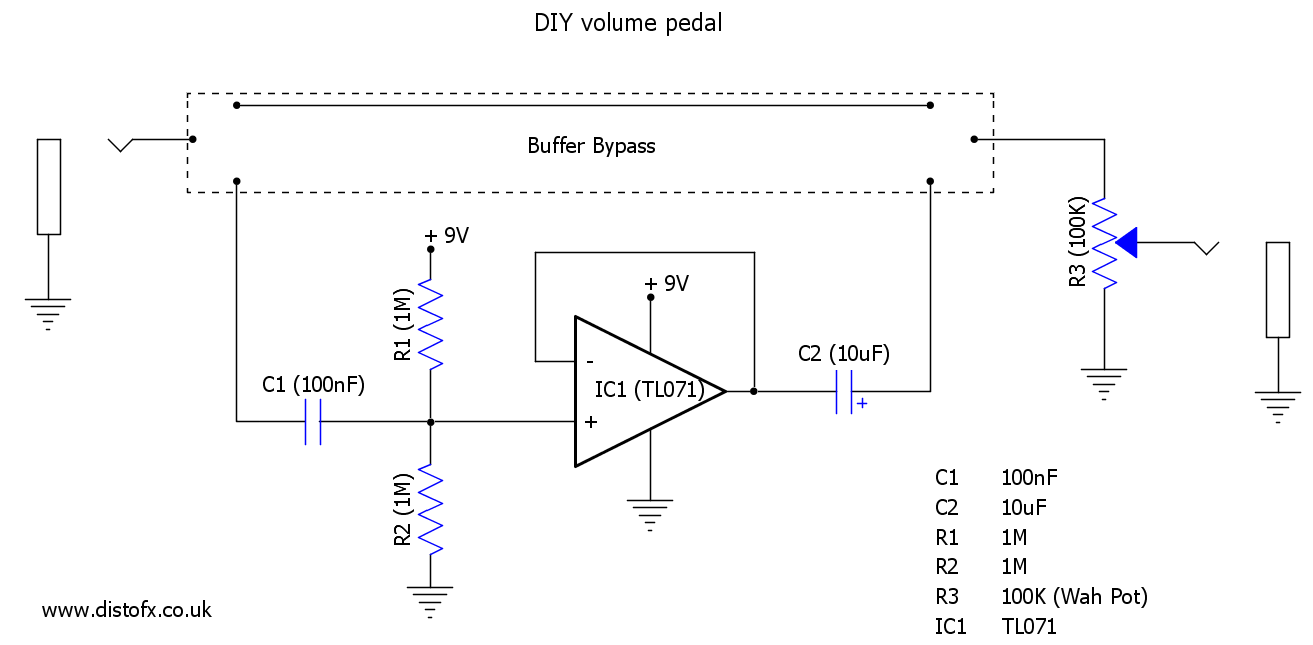 I finally built my ‘drop-in’ DIY volume pedal circuit. The circuit can be plugged directly into a Dunlop Cry Baby. However, the potentiometer in wah pedals uses a different taper, ICAR I believe. Because of the way the human ear responds to sound a logarithmic or audio taper is preferred but existing wah pots will work.